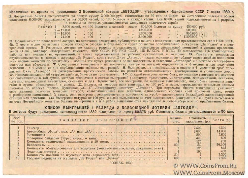 Билет авто-лотереи. I разряд. Синий фон и рамка. 2-я Всесоюзная авто-лотерея 1930 г.