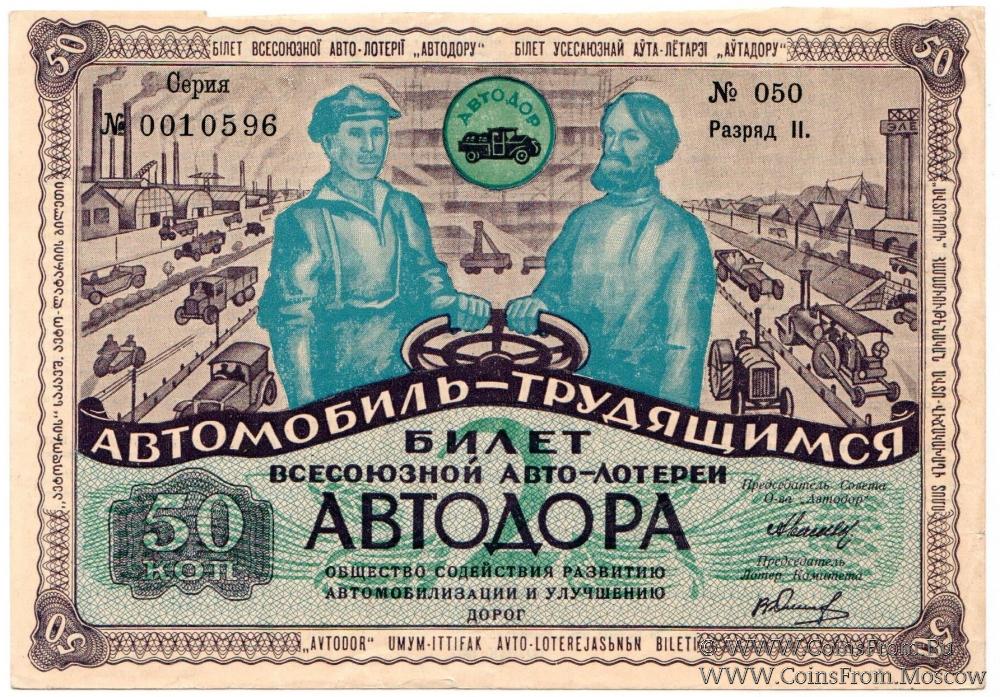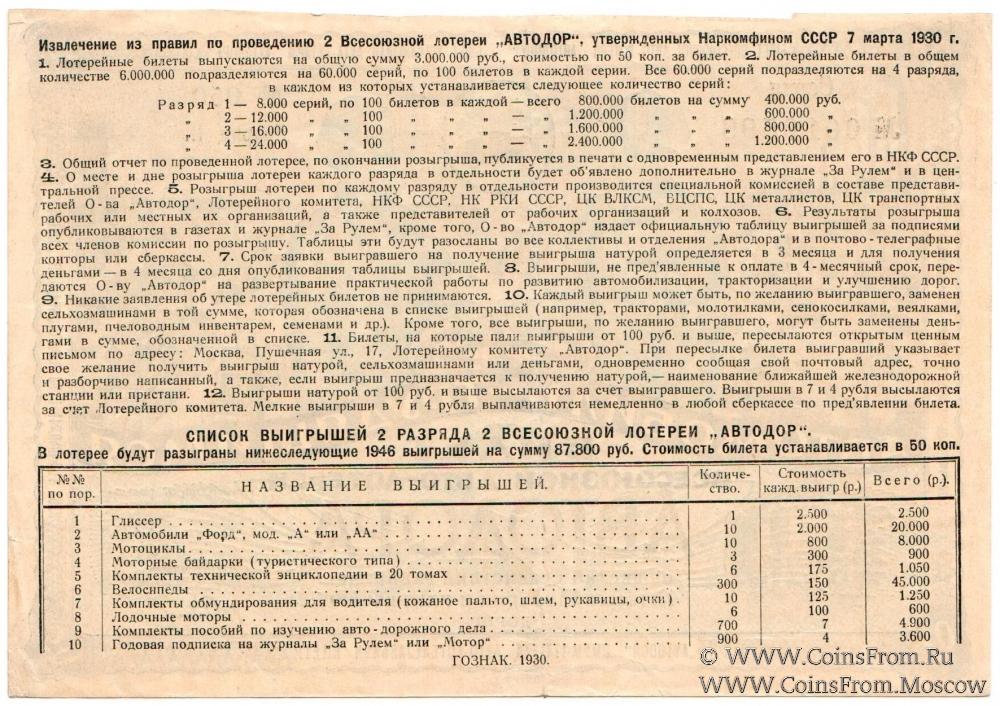 Билет авто-лотереи. II разряд. Коричневый фон и рамка. 2-я Всесоюзная авто-лотерея 1930 г.
