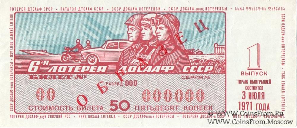 Билет. Выпуск 1. Типографская надпечатка красного цвета по диагонали "ОБРАЗЕЦ". 6-я Лотерея.