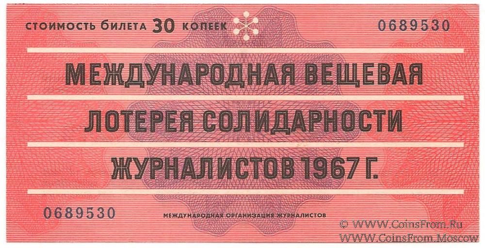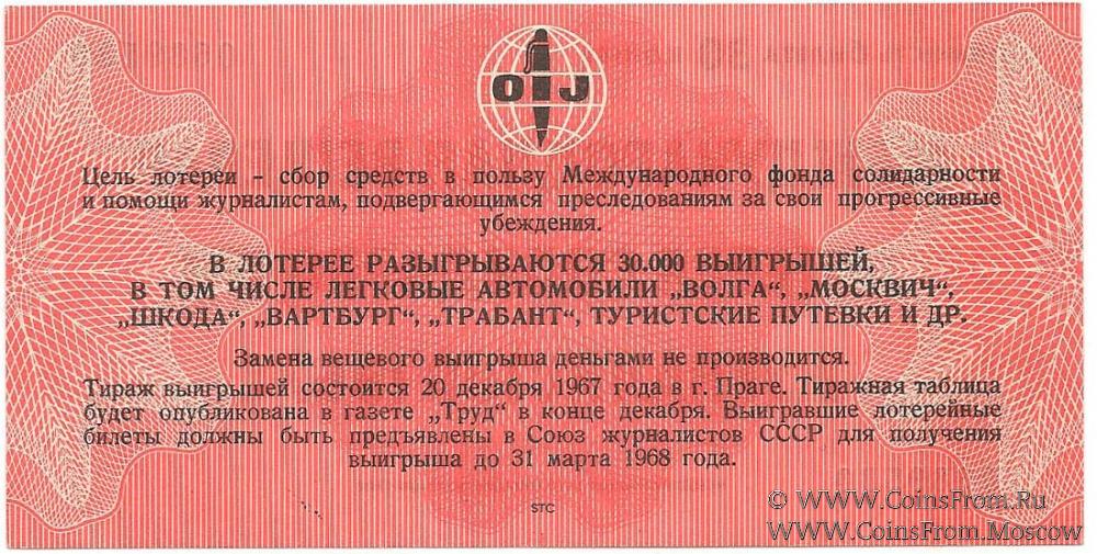 Билет. Водяной знак. Тираж в г. Праге (ЧССР). Международная вещевая лотерея солидарности журналистов.