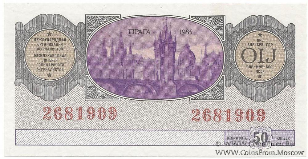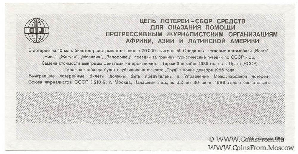 Билет. Водяной знак. Тираж в г. Праге (ЧССР). Международная лотерея солидарности журналистов.