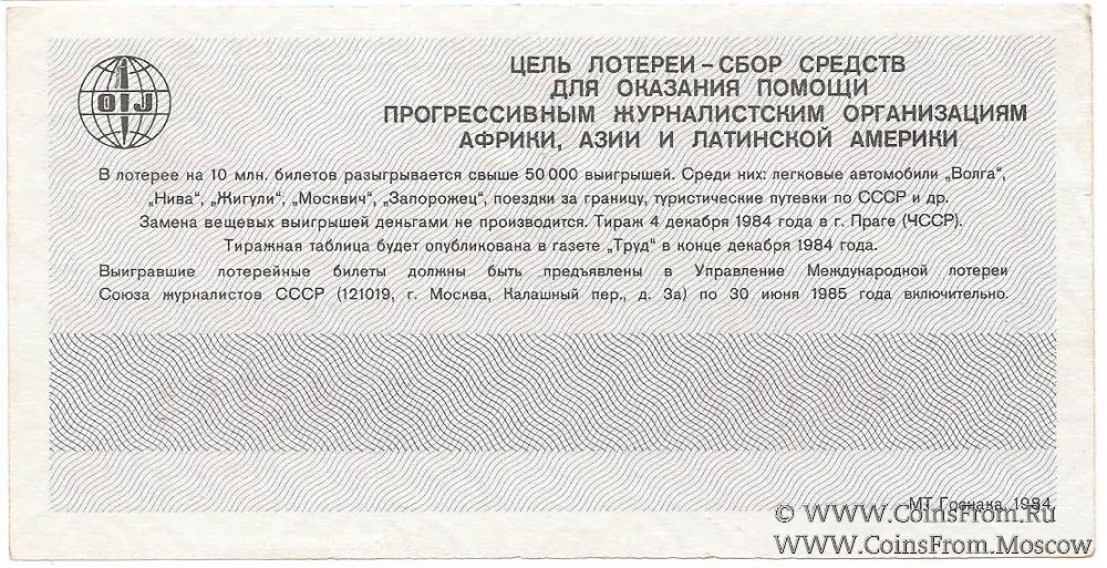 Билет. Водяной знак. Тираж в г. Праге (ЧССР). Международная лотерея солидарности журналистов.