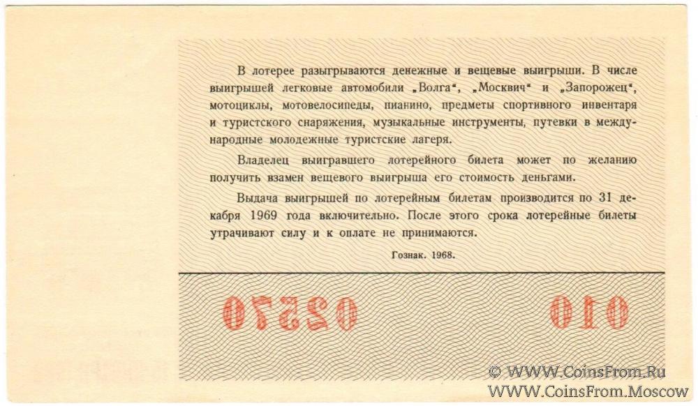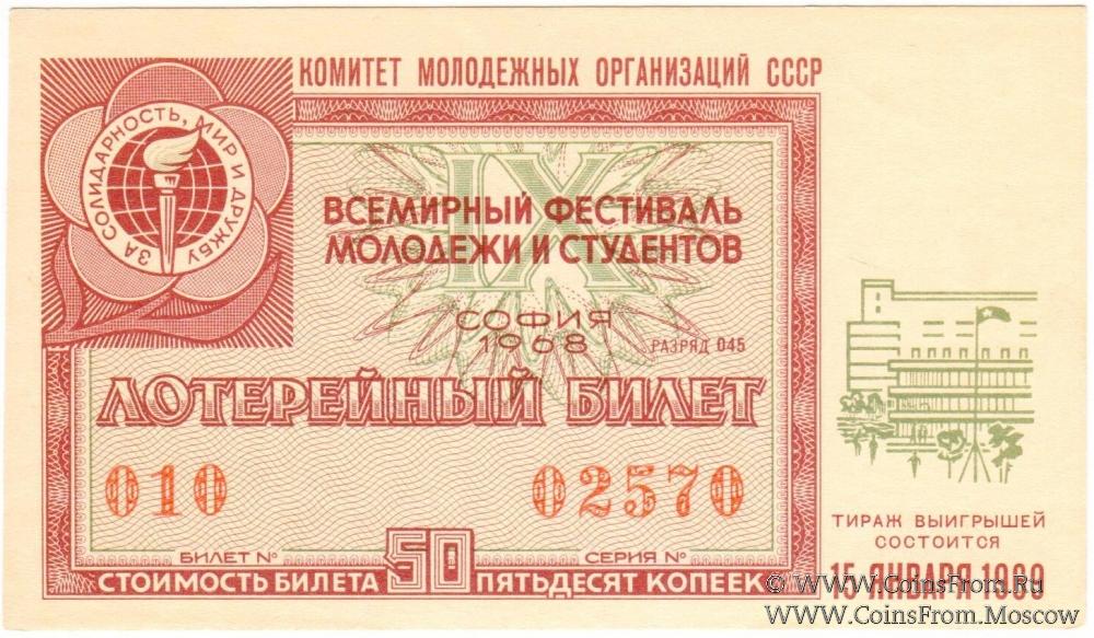 Лотерейный билет. Денежно-вещевая лотерея "9-й Всемирный фестиваль молодежи и студентов". София, 1968 г.