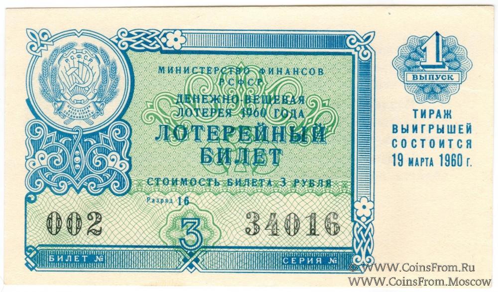 Лотерейный билет. Выпуск 1. Денежно-вещевая лотерея 1960 г.