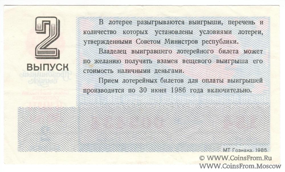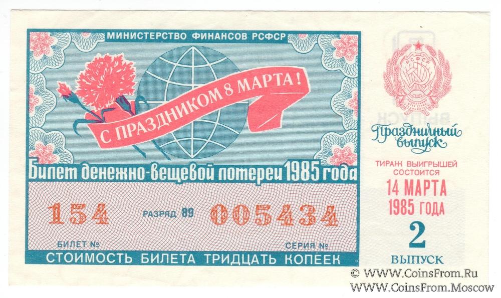 Билет. Выпуск 2. Праздничный выпуск - "8 марта". Денежно-вещевая лотерея 1985 г.