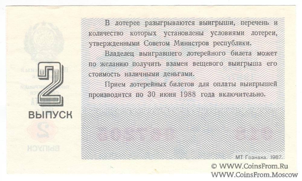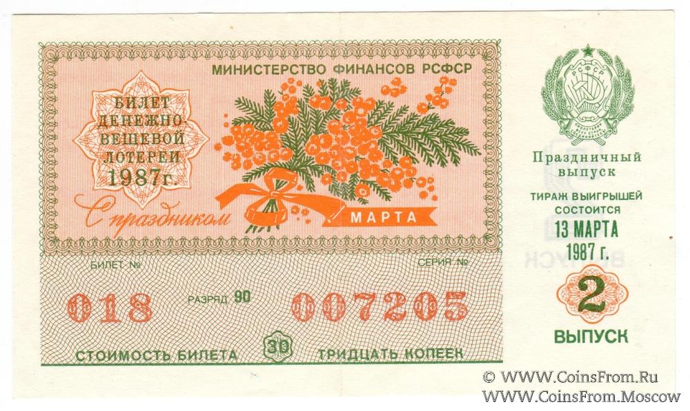 Билет. Выпуск 2. Праздничный выпуск - "8 марта". Денежно-вещевая лотерея 1987 г.