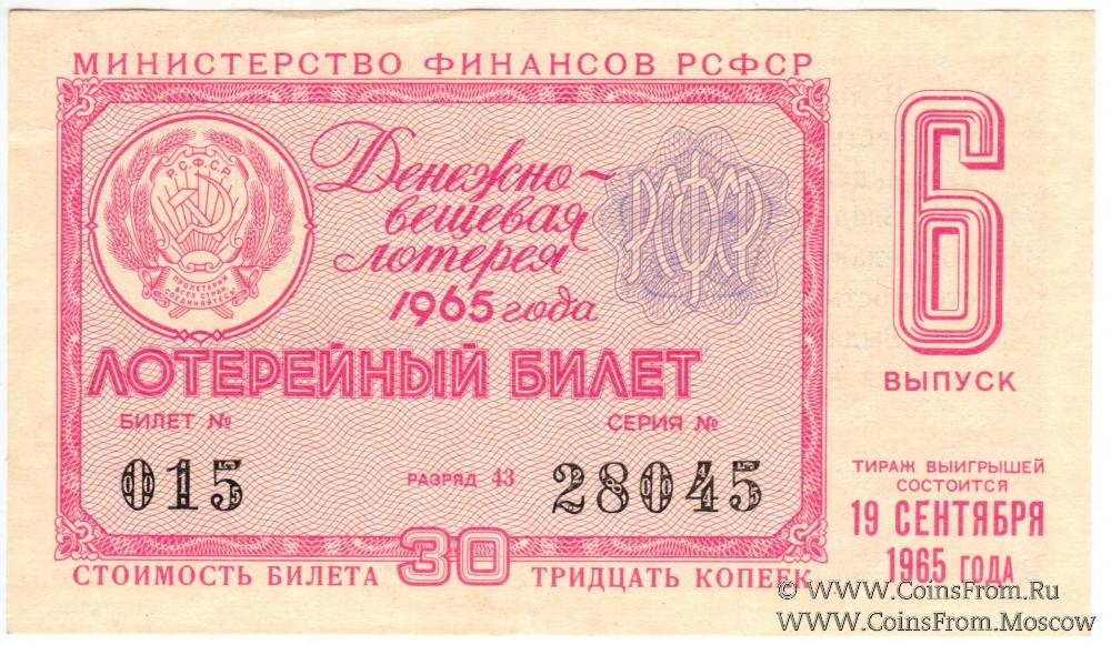 Лотерейный билет. Выпуск 6. Денежно-вещевая лотерея 1965 г.