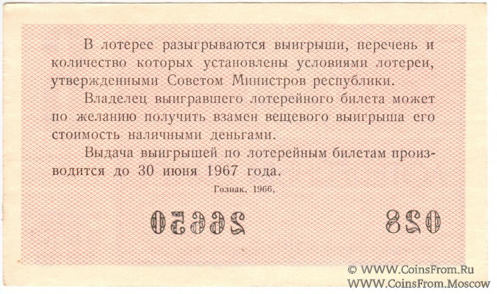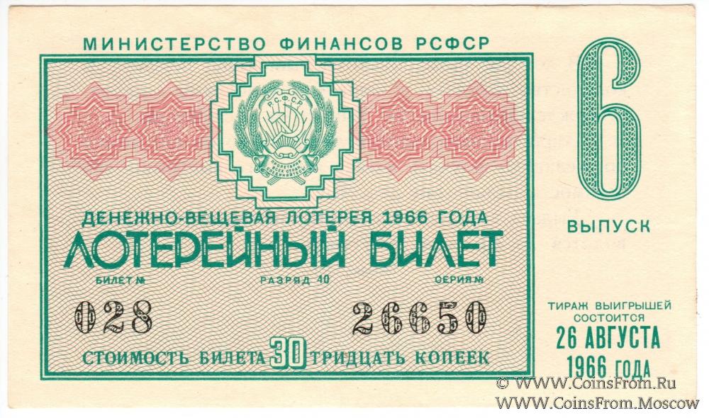Лотерейный билет. Выпуск 6. Денежно-вещевая лотерея 1966 г.