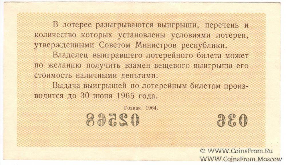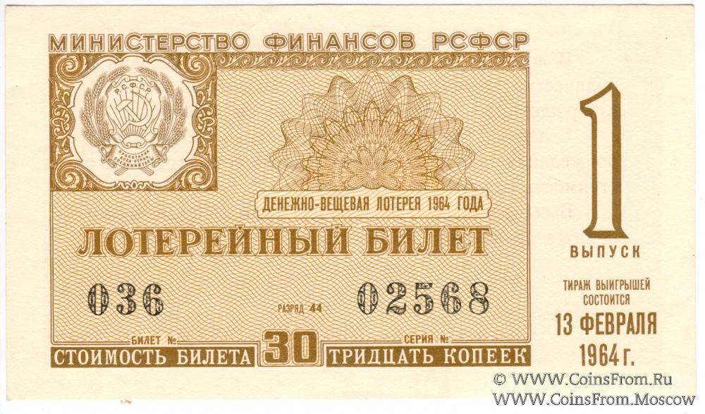 Лотерейный билет. Выпуск 1. Денежно-вещевая лотерея 1964 г.