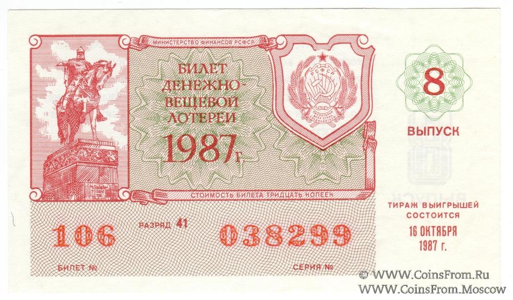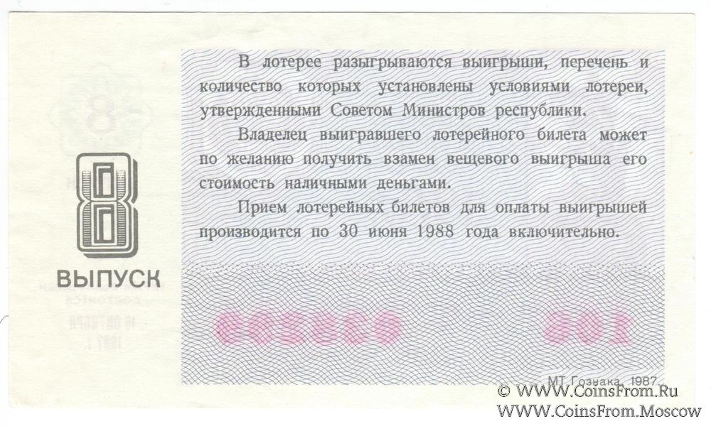 Билет. Выпуск 8. Денежно-вещевая лотерея 1987 г.
