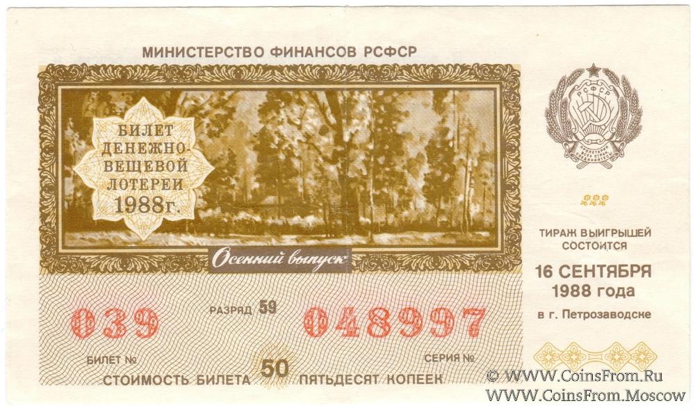 Билет. Осенний выпуск. Тираж в г. Петрозаводске. Денежно-вещевая лотерея 1988 г.