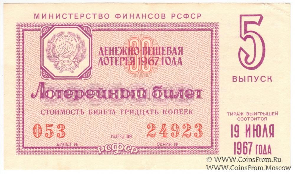 Лотерейный билет. Выпуск 5. Денежно-вещевая лотерея 1967 г.