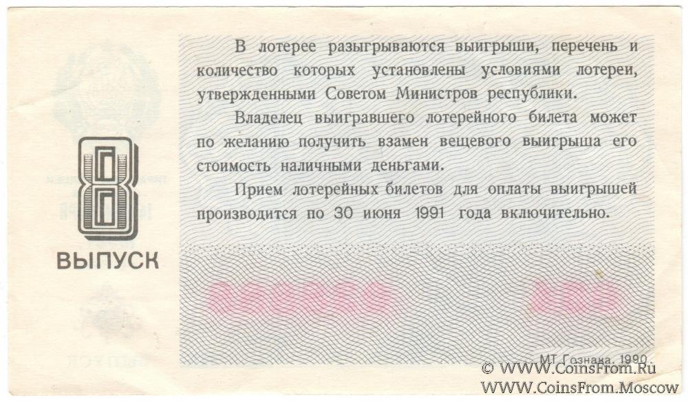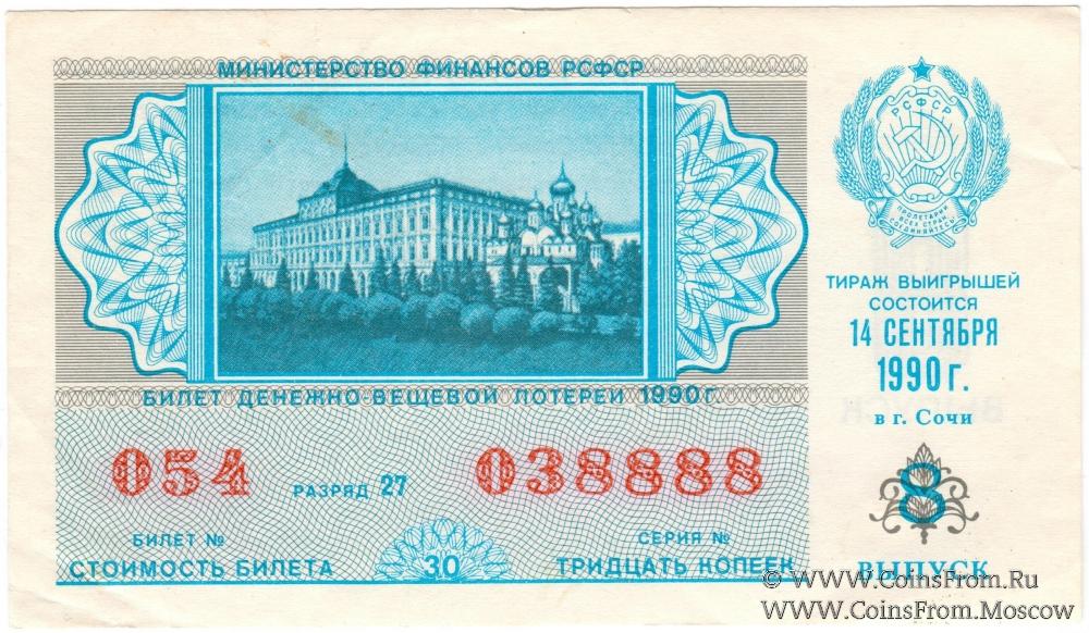Билет. Выпуск 8. Тираж в г. Сочи. Денежно-вещевая лотерея 1990 г.