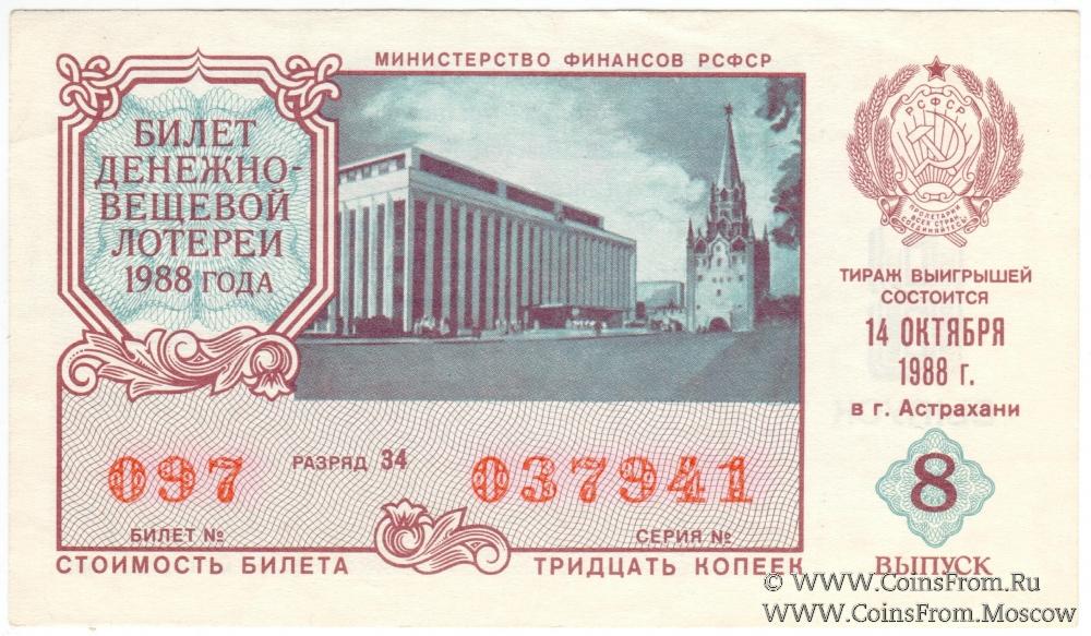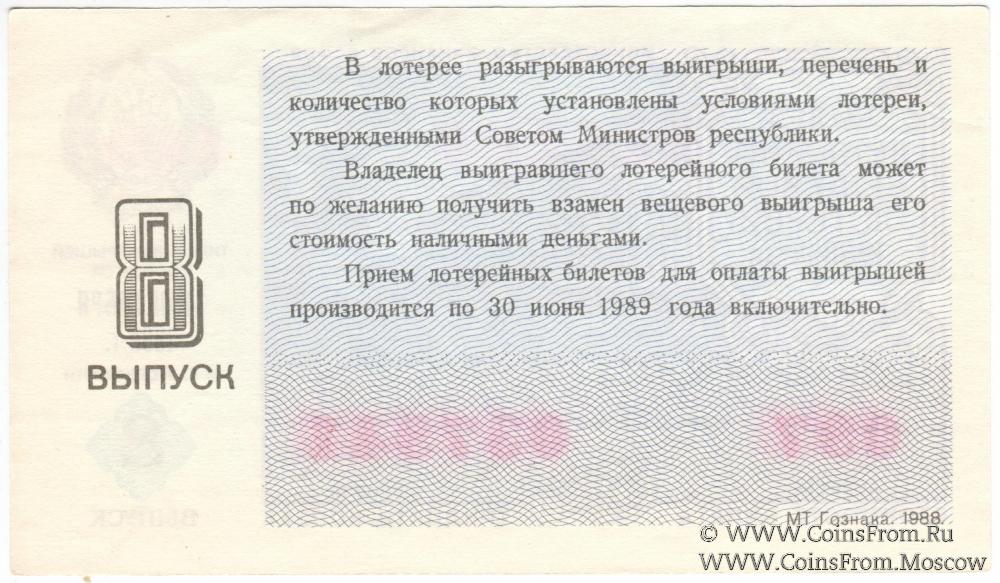 Билет. Выпуск 8. Тираж в г. Астрахани. Денежно-вещевая лотерея 1988 г.