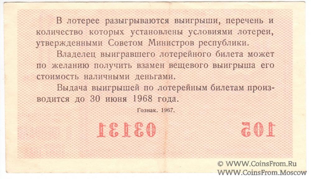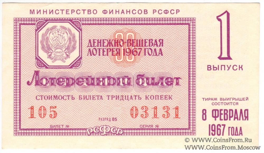 Лотерейный билет. Выпуск 1. Денежно-вещевая лотерея 1967 г.