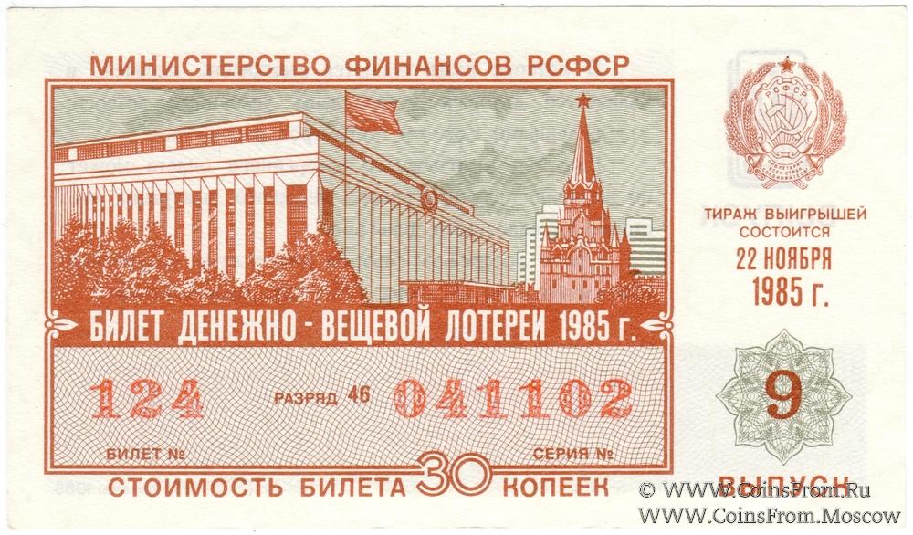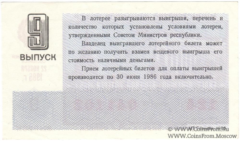Билет. Выпуск 9. Денежно-вещевая лотерея 1985 г.