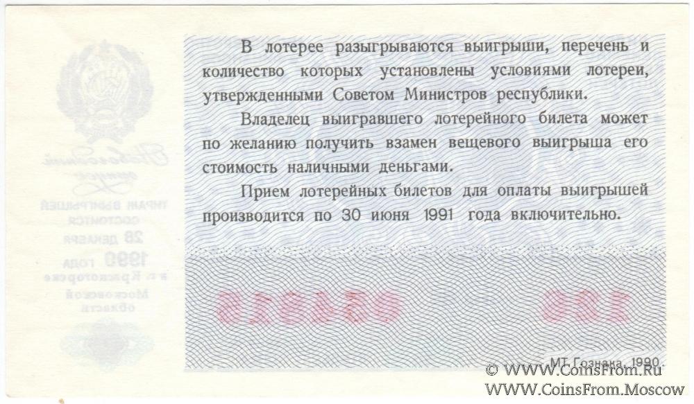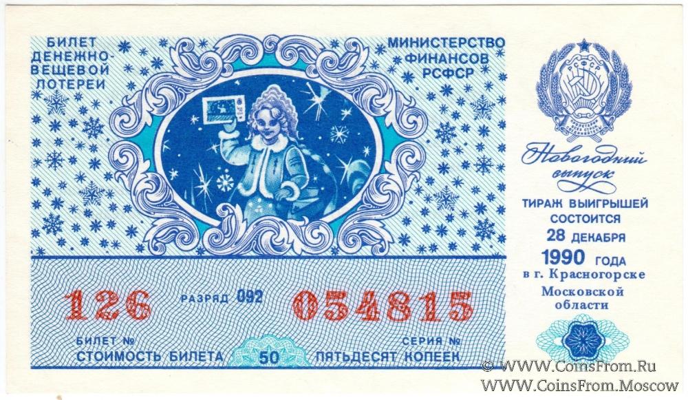 Билет. Новогодний выпуск. Тираж в г. Красногорске Московской области. Денежно-вещевая лотерея 1990 г.