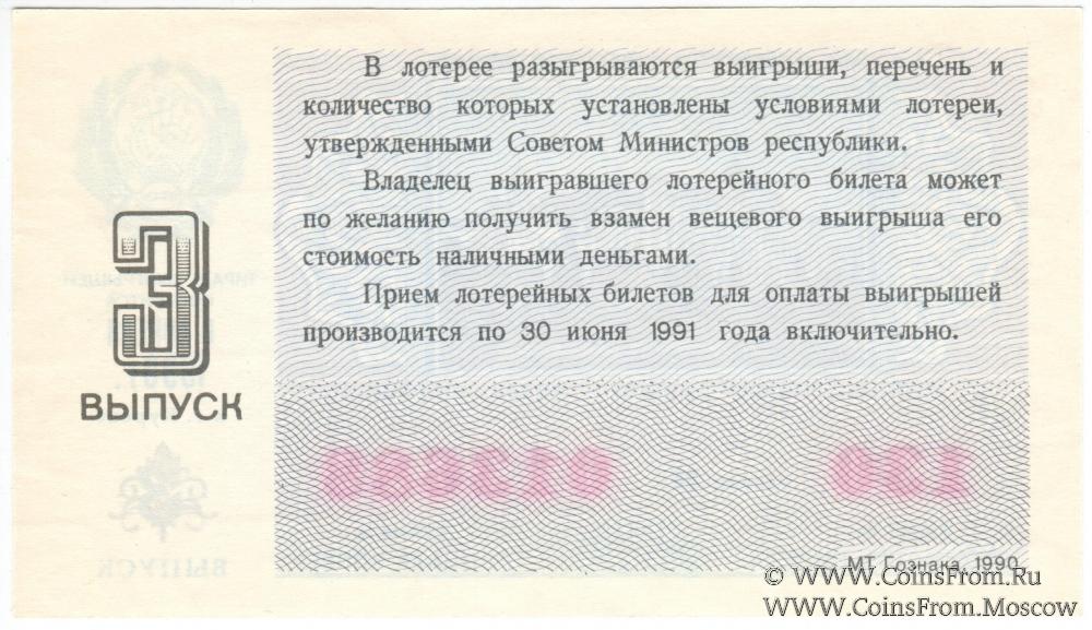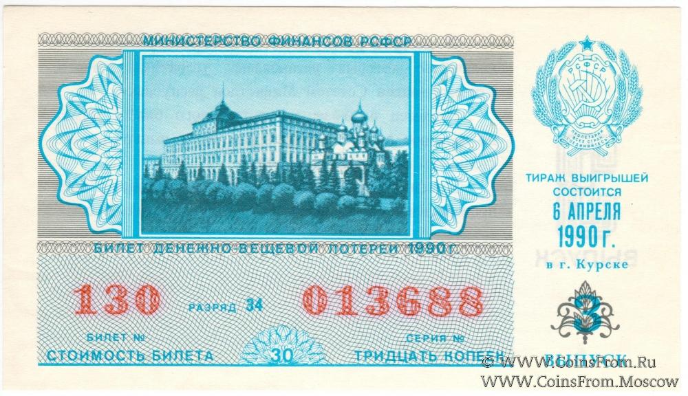 Билет. Выпуск 3. Тираж в г. Курске. Денежно-вещевая лотерея 1990 г.