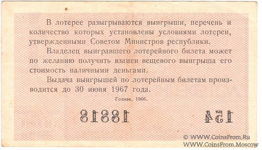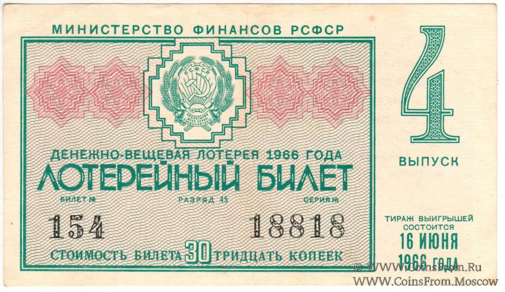 Лотерейный билет. Выпуск 4. Денежно-вещевая лотерея 1966 г.