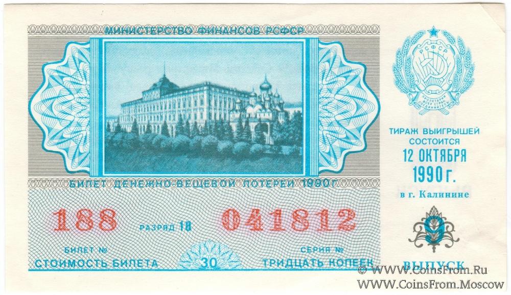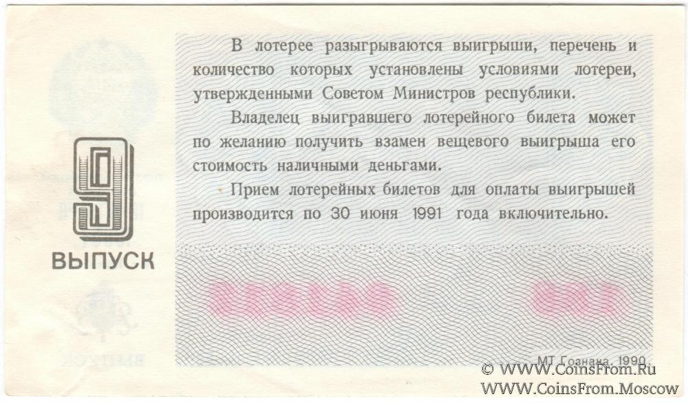 Билет. Выпуск 9. Тираж в г. Калинине. Денежно-вещевая лотерея 1990 г.