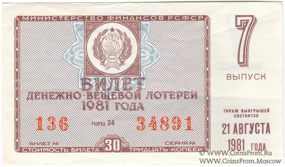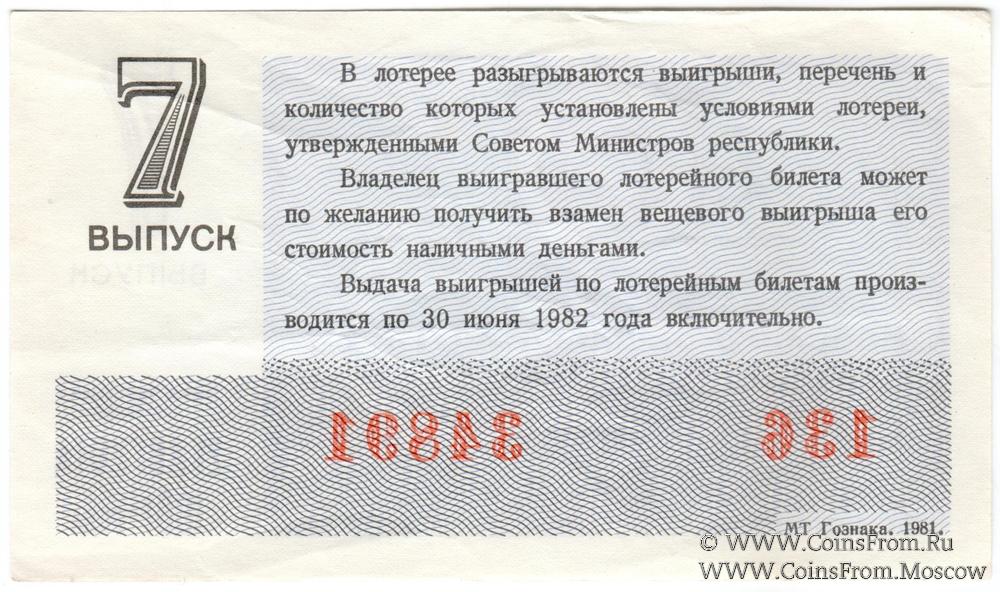 Билет. Выпуск 7. Денежно-вещевая лотерея 1981 г.