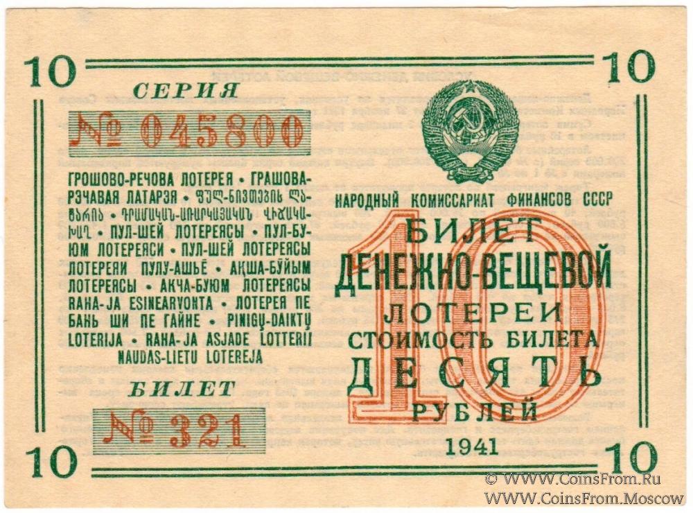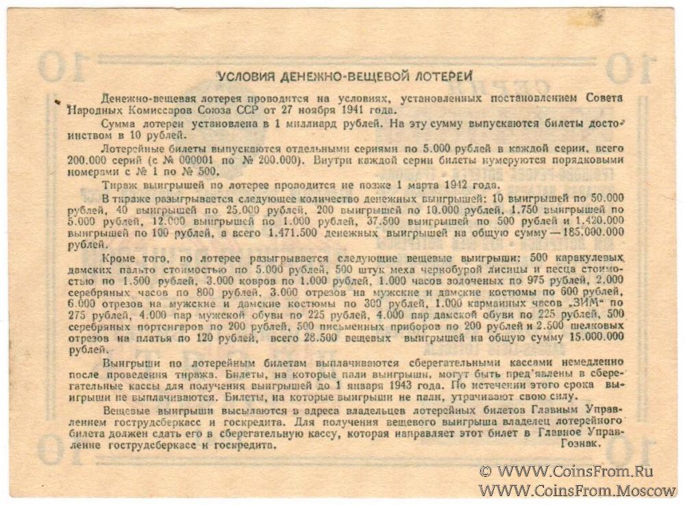 Билет. Серии 000001-280000. Водяной знак - волны вертикальные. Денежно-вещевая лотерея 1941 г.