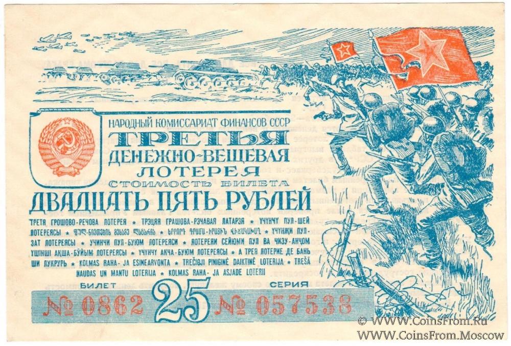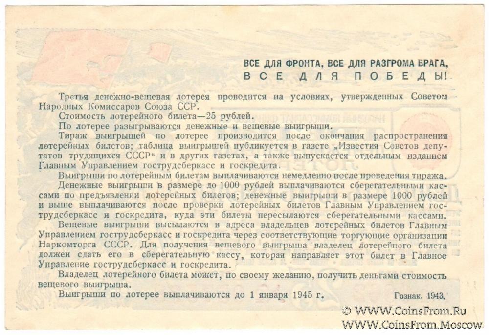 Билет. Водяной знак - волны горизонтальные. 3-я Денежно-вещевая лотерея 1943 г.