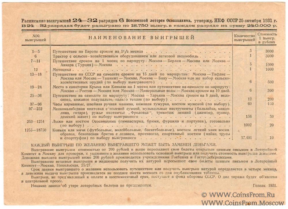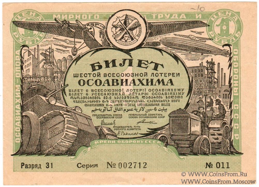 Билет. Зеленого цвета. Водяной знак. Разряды 07-34. 6-я Всесоюзная лотерея 1931 г.