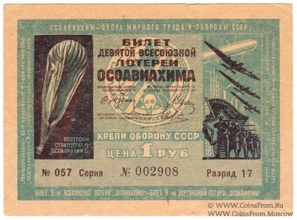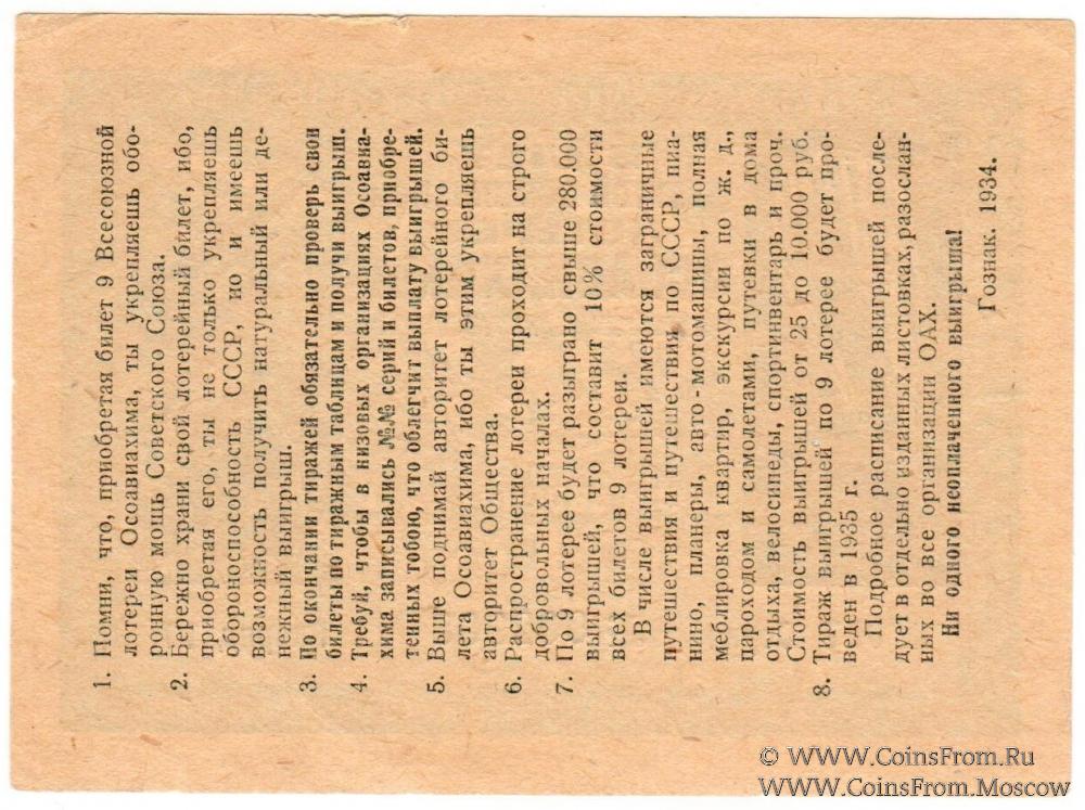Билет. Бумага жёлтая. Водяной знак. Разряды 1-17. 9-я Всесоюзная лотерея 1934 г.