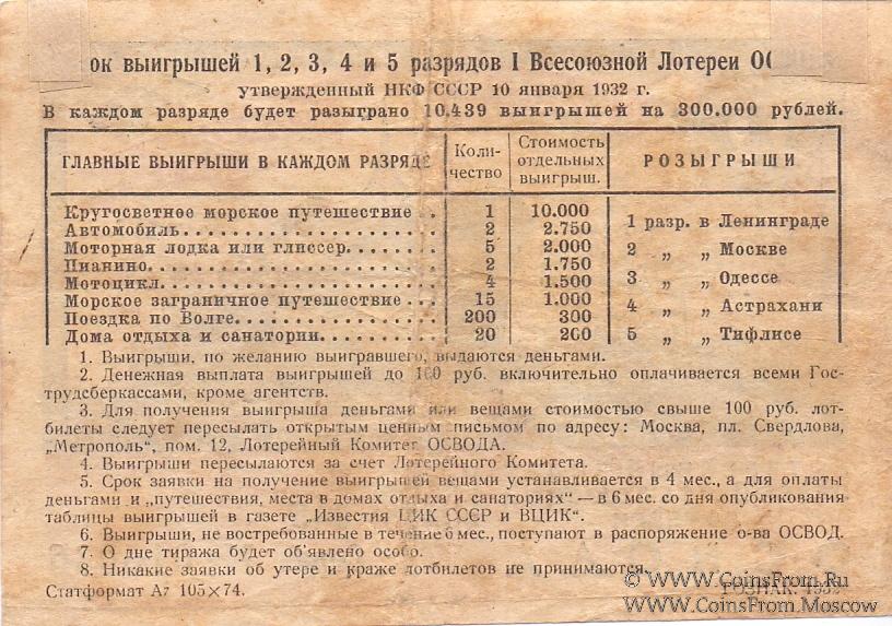 Лотерейный билет. Разряд 2 - Москва. 1-я Всесоюзная лотерея.