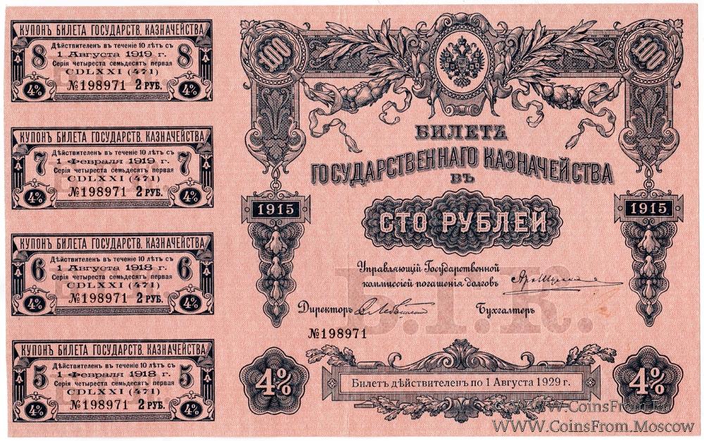 Ежегодный доход - 4%. Проценты начисляются с 1 августа 1915 г.