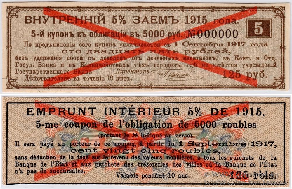 Купон Внутреннего 5% займа 1915 к облигации. ОБРАЗЕЦ. Купон № 5.