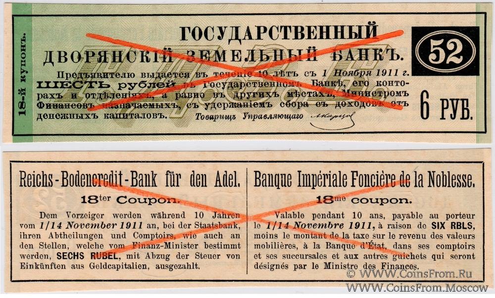 ОБРАЗЕЦ. Купон № 18. Контрольный № 52. 3-й выпуск. 1-й купонный лист. Купоны 4 % Закладных листов Государственного Дворянского Земельного Банка.