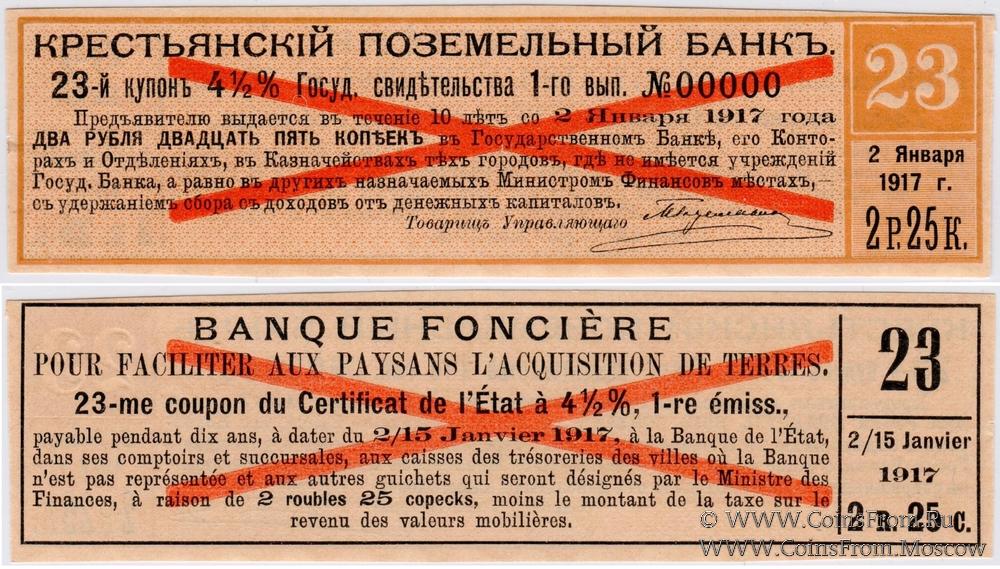 ОБРАЗЕЦ. Купон № 23. Контрольный № 23. 1-й выпуск 1906 г. 2-й купонный лист. Купоны 4 1/2 % Государственных свидетельств Крестьянского Поземельного Банка.