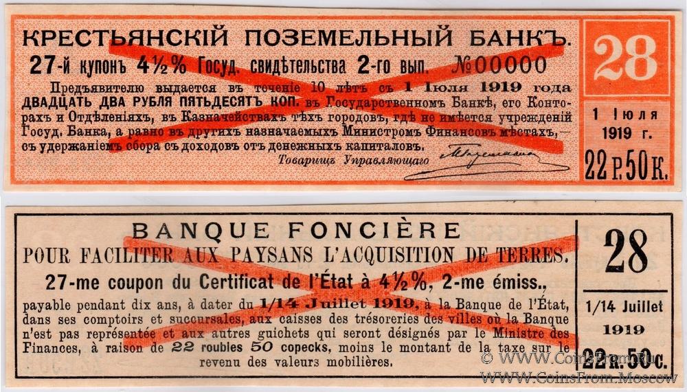 Купоны 4 1/2 % Государственных свидетельств Крестьянского Поземельного Банка.