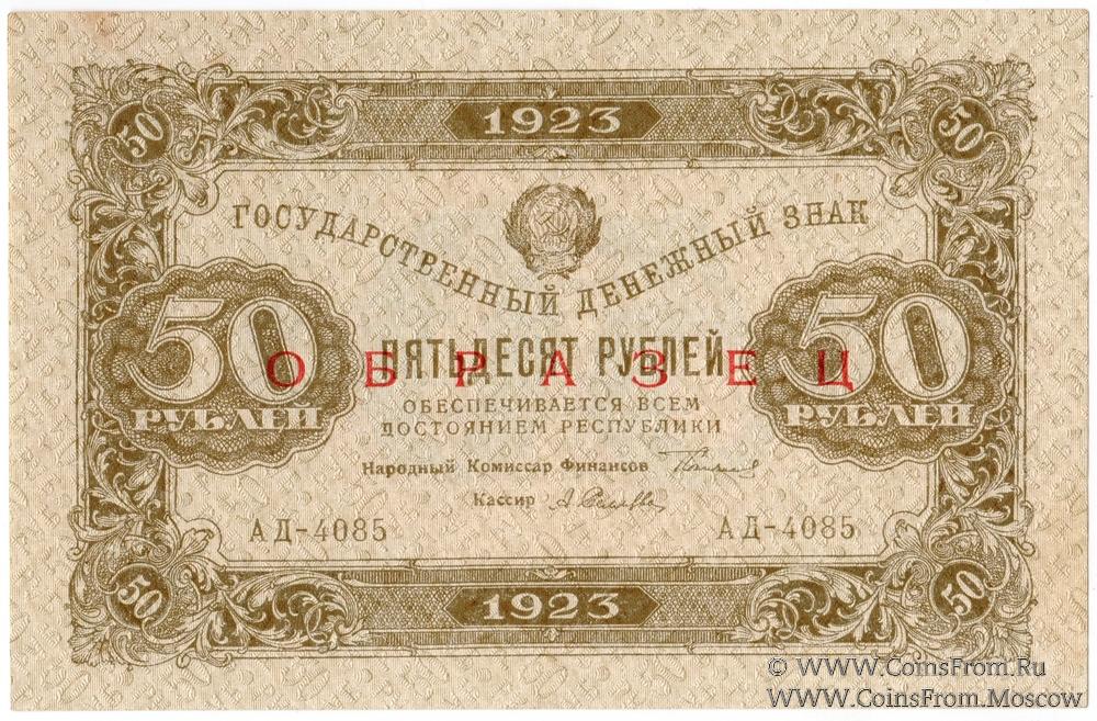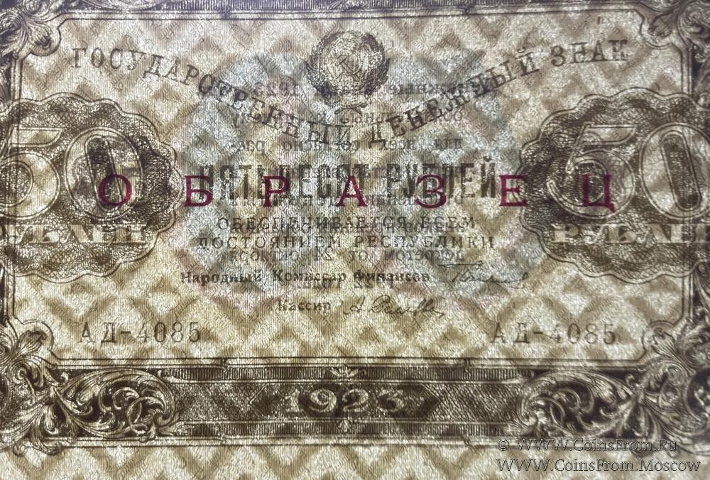 Государственный денежный знак РСФСР 50 рублей образца 1923 г. ОБРАЗЕЦ: горизонтальная надпечатка красного цвета "ОБРАЗЕЦ" на аверсе (на реверсе зеркально). Кассир - А. Селляво. Надпись на реверсе - вариант 2. Водяной знак - теневые квадраты (уголки). Бюджетно-расчетное управление Народного Комиссариата Финансов РСФСР. 1-я Московская Фабрика Гознака.