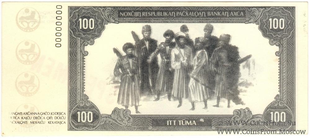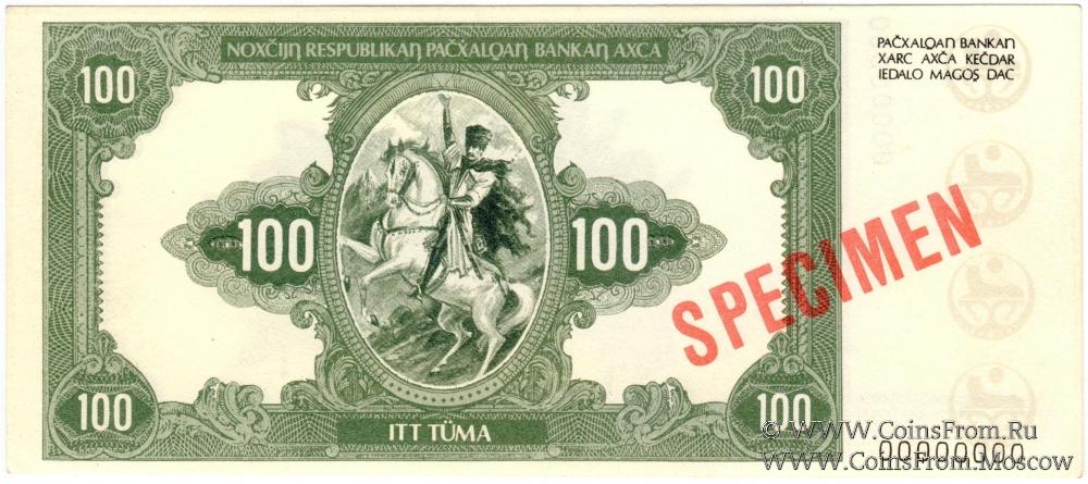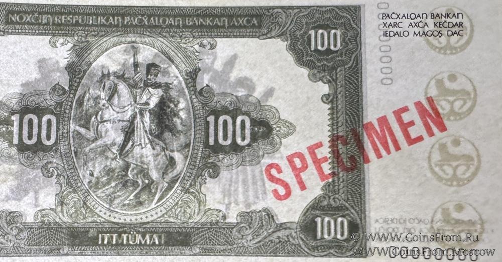 Выпуск (несостоявшийся) 1995 г. ОБРАЗЕЦ двусторонний: диагональная надпечатка красного цвета "SPECIMEN" на аверсе. Государственный Банк Чеченской Республики.