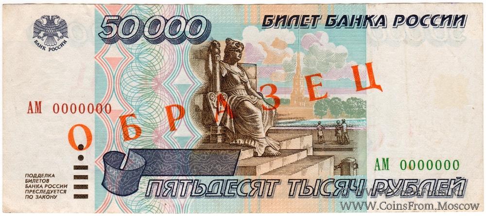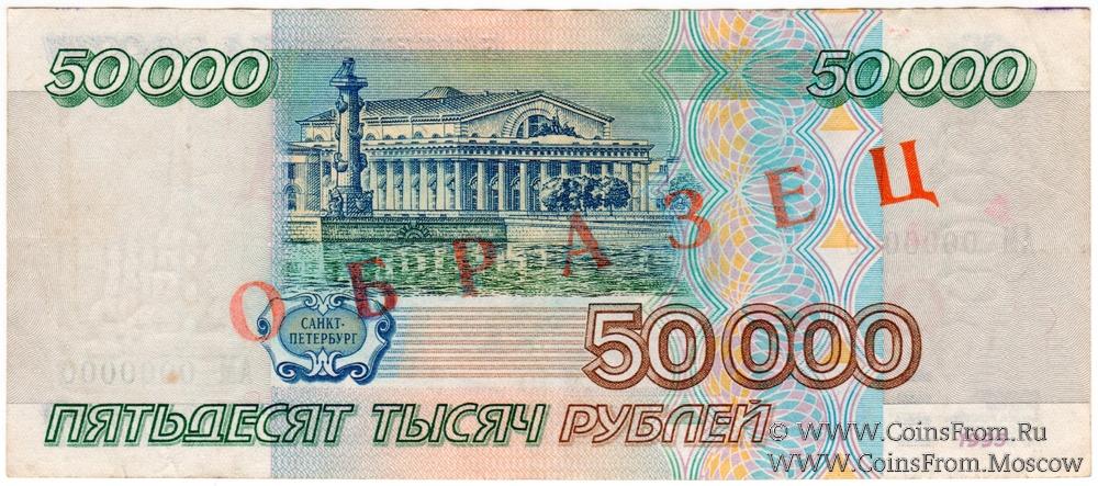 Билет Банка России образца 1995 г. Диагональная надпечатка красного цвета "ОБРАЗЕЦ" на аверсе и реверсе.