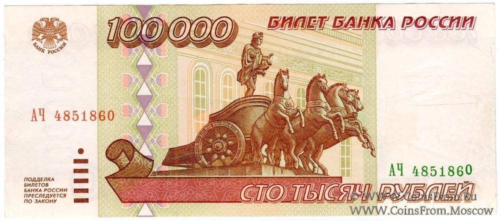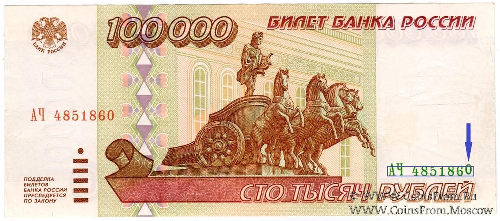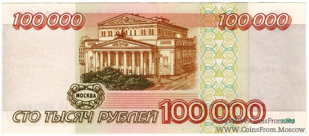 Водяной знак - Большой театр в Москве (на широком купонном поле), номинал "100000" (на узком купонном поле).