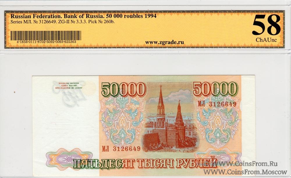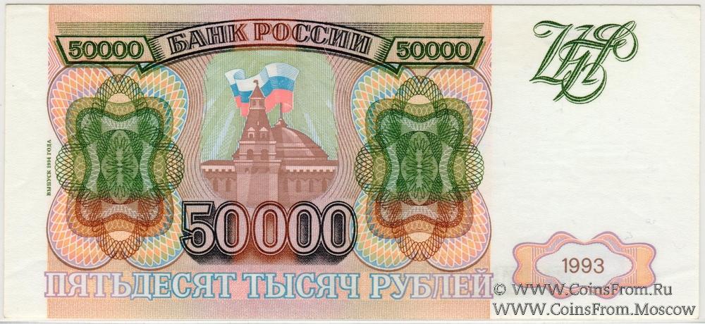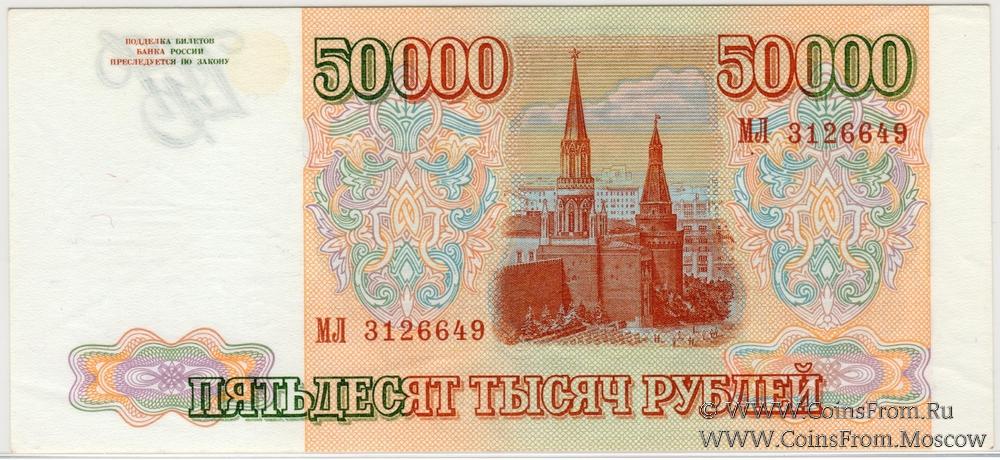 Серия МЛ. Водяной знак на купонной части банкноты - Сенатская башня Московского Кремля, под башней номинал "50000". Центральный Банк России. ГОЗНАК.