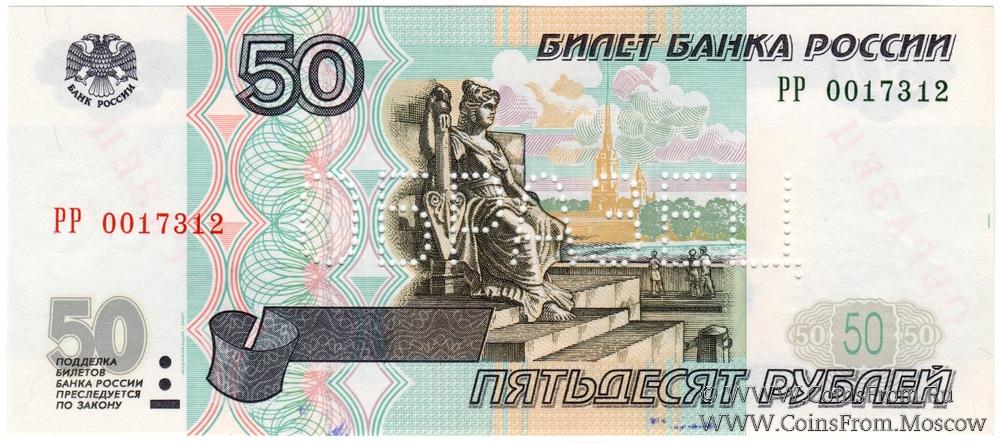 ОБРАЗЕЦ (двусторонний): горизонтальная перфорация слова "ОБРАЗЕЦ"; диагональная надпечатка красного цвета "ОБРАЗЕЦ" дважды на реверсе. Серия РР, номер произвольный. Тип серии "ХХ". ГОЗНАК.