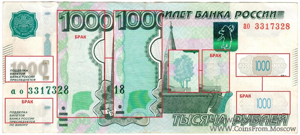 Билет Банка России образца 1997 г. Выпуск 2010 г. (модификация 2010 г.). БРАК печати: непропечатки на аверсе. ГОЗНАК.