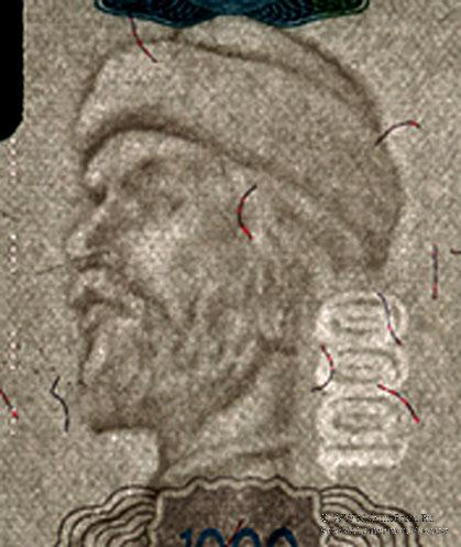 • примыкающий к полутоновому водяному знаку филигранный водяной знак — цифровое обозначение номинала - число 1.000. Филигранный водяной знак имеет участки более светлые, чем бумага и полутоновый водяной знак. Его отличает наличие темных штрихов, оттеняющих цифры и создающих эффект их объемности.