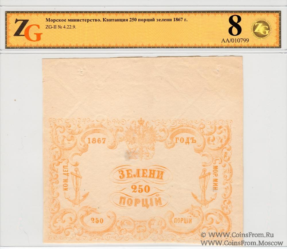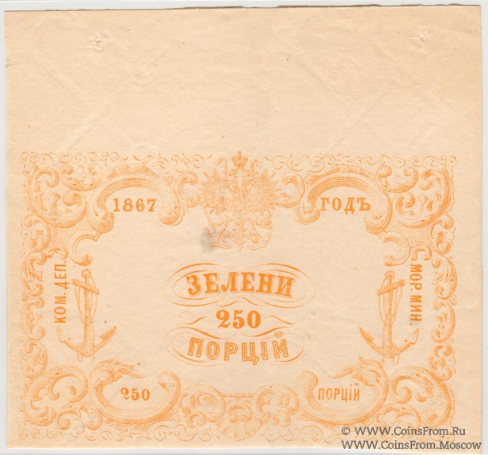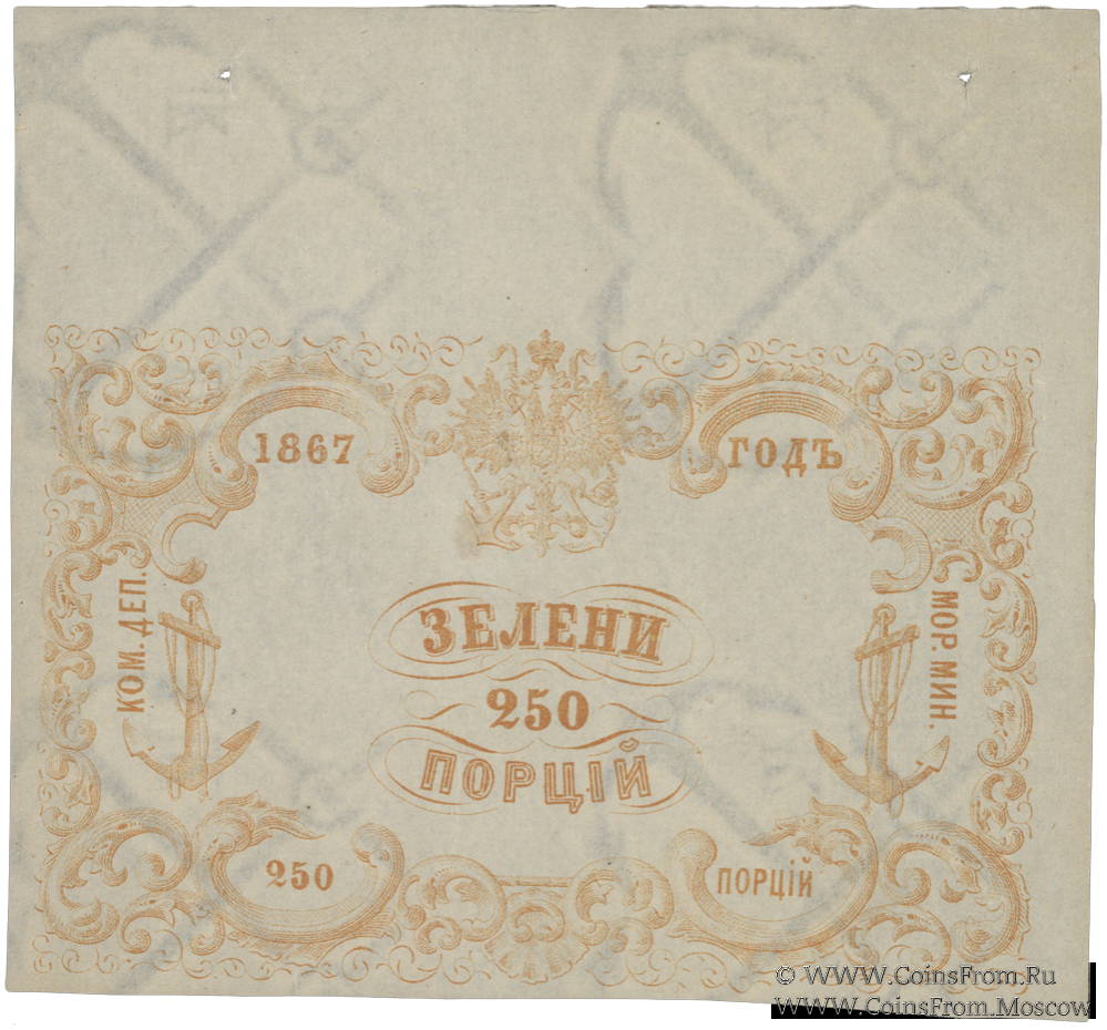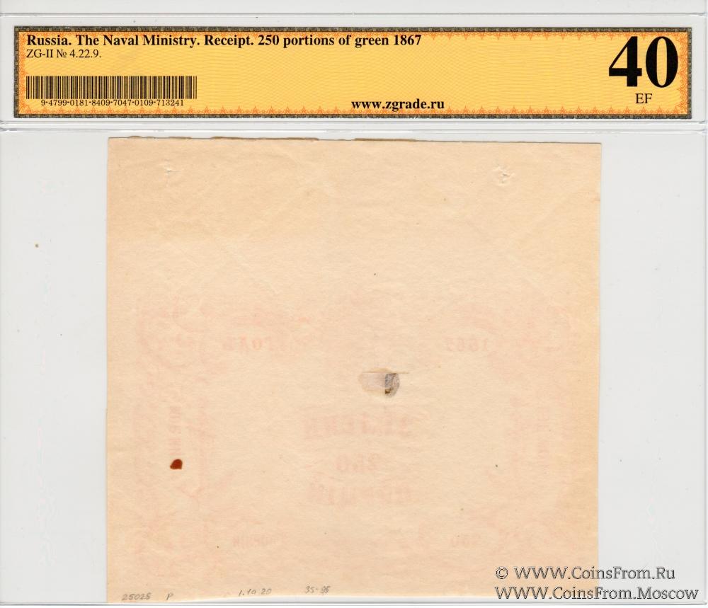 В середине XIX века по указанию морского министра коммерческим департаментом морского министерства производился выпуск квитанций для безналичной оплаты продовольствия, необходимого для экипажей морских судов. Оплата квитанций поставщику производилась при предъявлении в коммерческом департаменте морского министерства. Встречаются довольно редко.