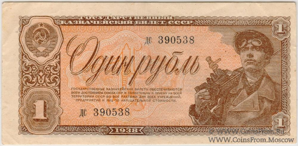 Государственный Казначейский Билет СССР образца 1938 г. БРАК обрезки (сдвиг). Формат серии хХ. Длина номера 15 мм. Государственный Банк СССР.