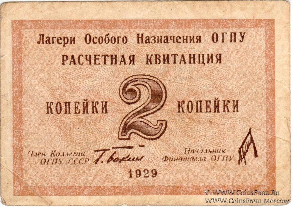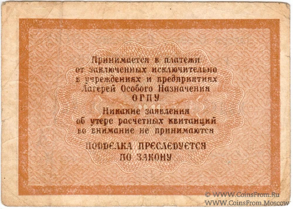 Расчетная квитанция. 1 выпуск. Подпись Бокий. Водяной знак - окна. Лагери Особого Назначения ОГПУ. Типография ГОЗНАК.
