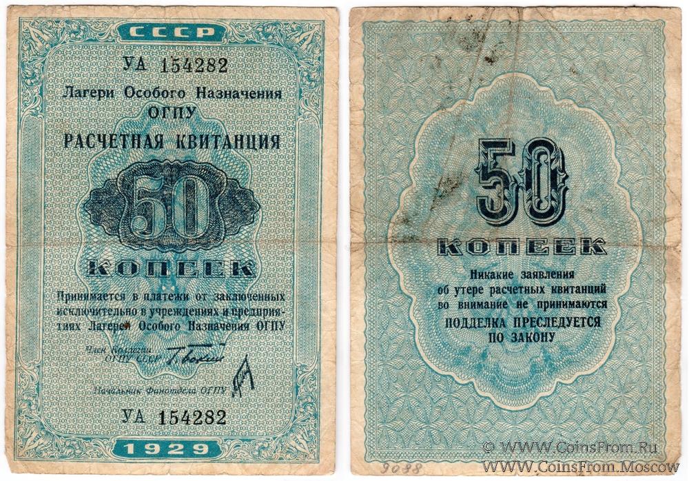 Расчетная квитанция. 1 выпуск. Серия УА. Подпись Бокий. Водяной знак - "окна". Лагери Особого Назначения ОГПУ. Типография ГОЗНАК.