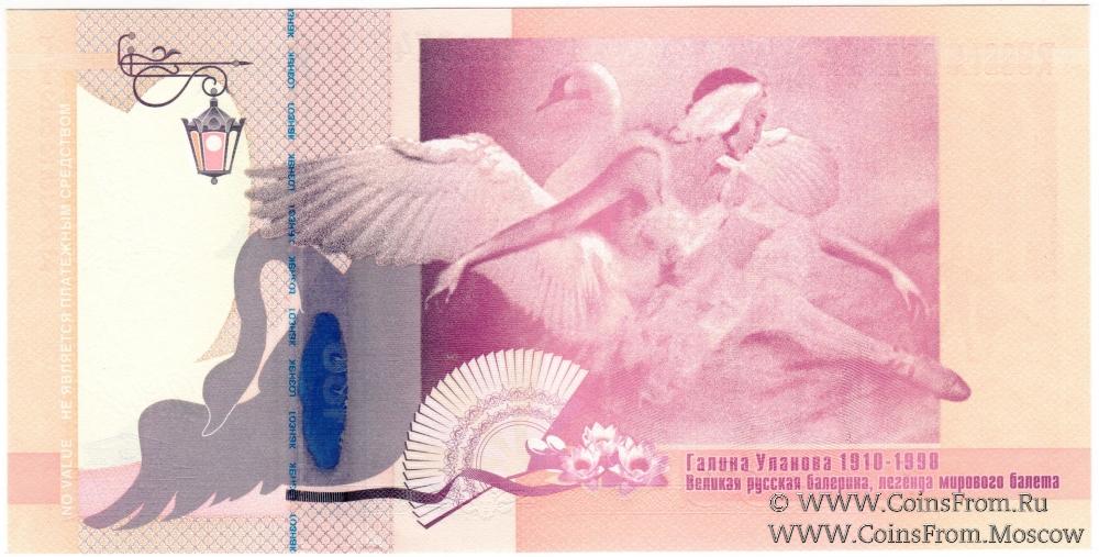 Рекламная банкнота "Галина Уланова 1910-1998. Великая русская балерина, легенда мирового балета". Серия ГТ. С номером. С полимерным прозрачным окном. ГОЗНАК.