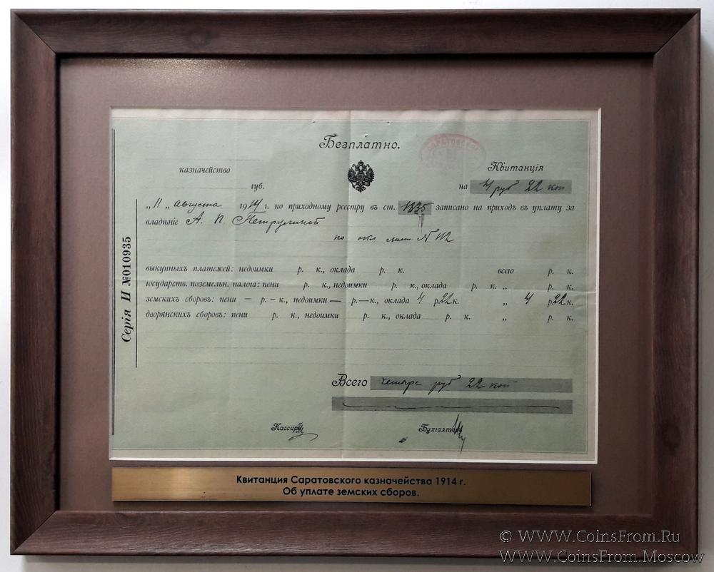 Квитанция Саратовского Казначейства 1914 г. Об уплате земских сборов. Подлинный старинный документ. Размер рамки 39х31,5 см.