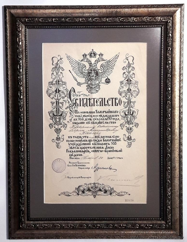 300-летие царствования Дома Романовых. Медаль и свидетельство на право ношения 1913 г.